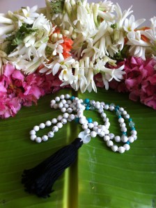 This mala is comprised of Howlite, Turquoise, Green Quartz & Quartz Crystal.