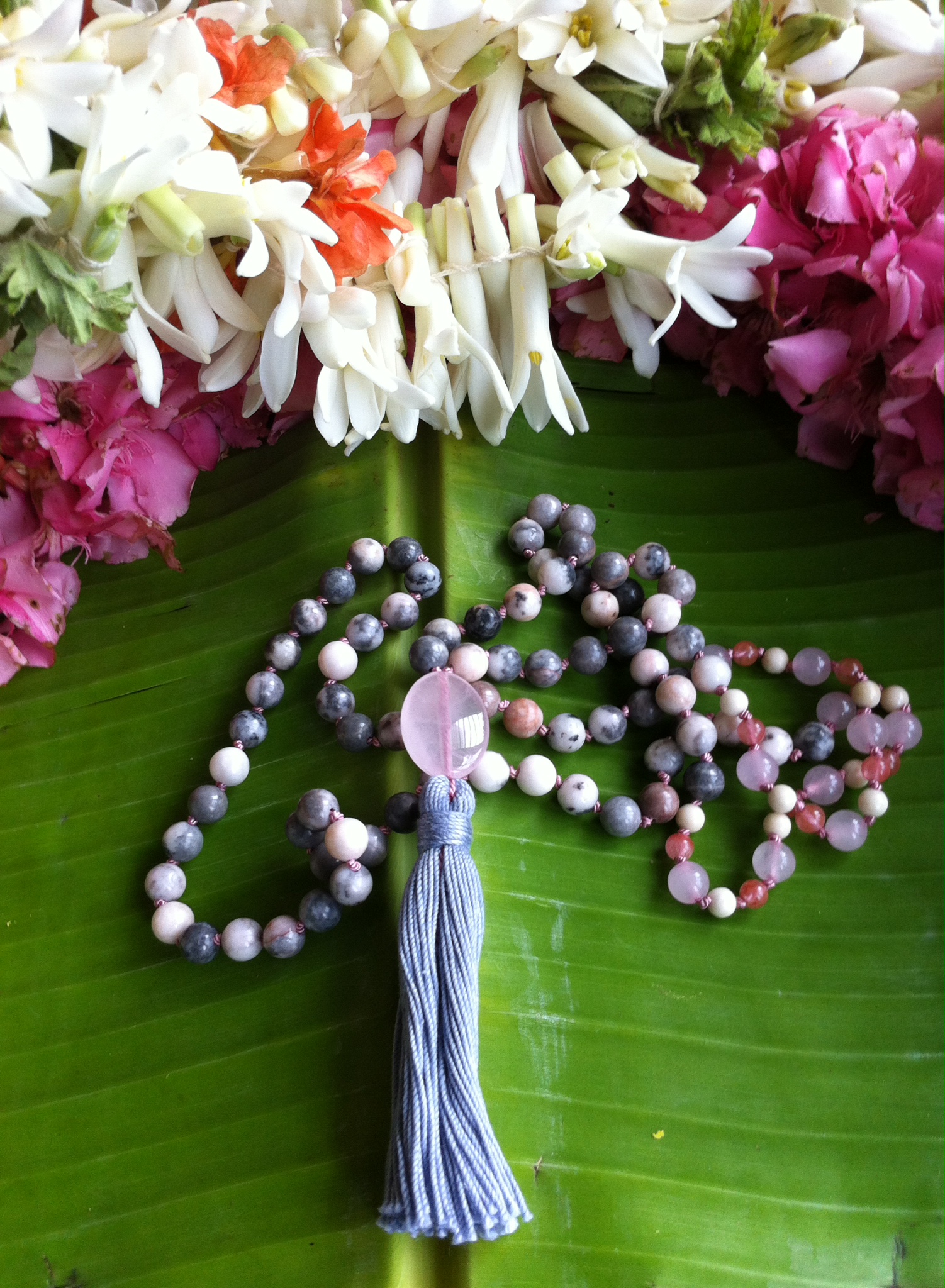 This mala is made with Pink Zebra Jasper, Cherry Quartz & Rose Quartz.