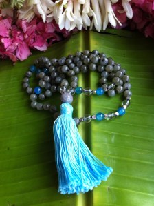 This Labradorite mala is accented with Crackled Agate, Quartz Crystal & Silver beads.