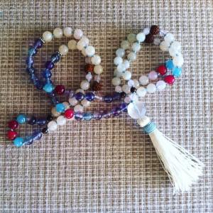 Full power mala made with white agate, fluorite, ruby, moonstone, garnet & rudraksha.